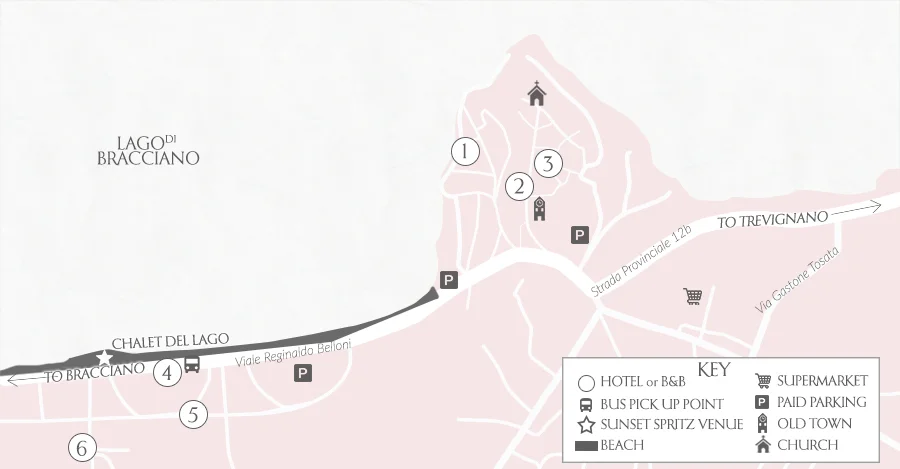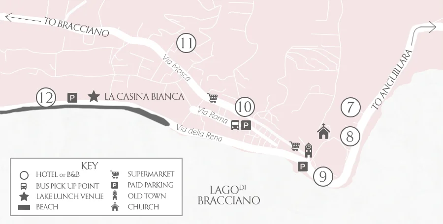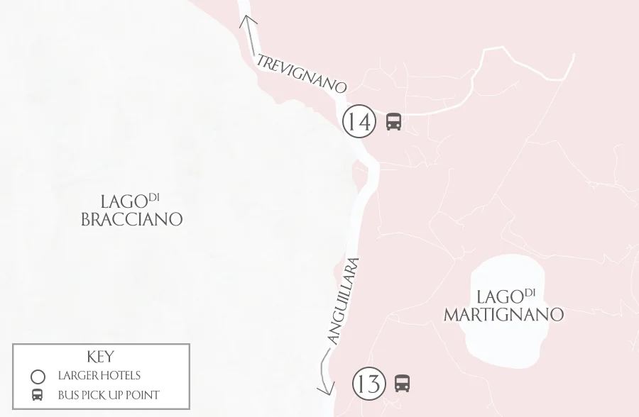 We recommend that all guests stay in the two larger hotels listed, or the basic B&Bs of Anguillara Sabazia and Trevignano Romano as shown on the maps below.
